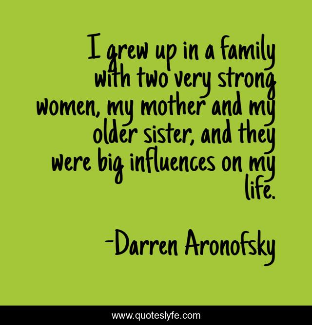 This page presents the quote "I grew up in a family with two very strong women, my mother and my older sister, and they were big influences on my life.". Author of this quote is Darren Aronofsky. This quote is about life, sister, women,.
