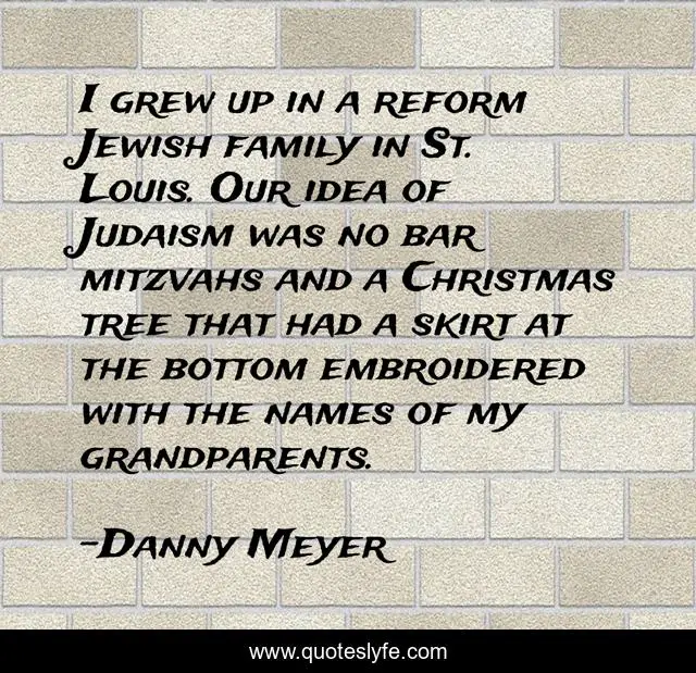 This page presents the quote "I grew up in a reform Jewish family in St. Louis. Our idea of Judaism was no bar mitzvahs and a Christmas tree that had a skirt at the bottom embroidered with the names of my grandparents.". Author of this quote is Danny Meyer. This quote is about grandparents, tree, family,.