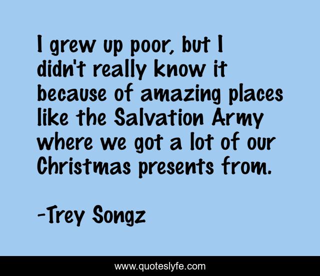 This page presents the quote "I grew up poor, but I didn't really know it because of amazing places like the Salvation Army where we got a lot of our Christmas presents from.". Author of this quote is Trey Songz. This quote is about amazing, army,.
