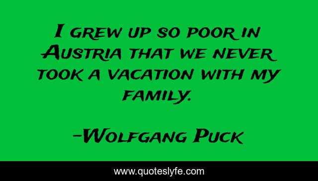 This page presents the quote "I grew up so poor in Austria that we never took a vacation with my family.". Author of this quote is Wolfgang Puck. This quote is about poor, vacation,.