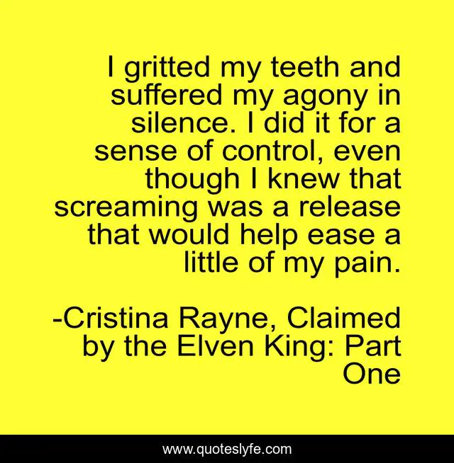 This page presents the quote "I gritted my teeth and suffered my agony in silence. I did it for a sense of control, even though I knew that screaming was a release that would help ease a little of my pain.". Author of this quote is Cristina Rayne, Claimed by the Elven King: Part One. This quote is about suffering, pain,.
