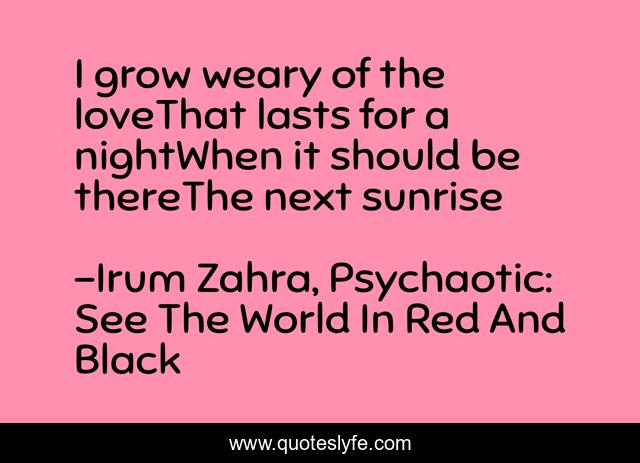 This page presents the quote "I grow weary of the loveThat lasts for a nightWhen it should be thereThe next sunrise". Author of this quote is Irum Zahra, Psychaotic: See The World In Red And Black. This quote is about literature, art, betrayal, poetry, love, affection,.