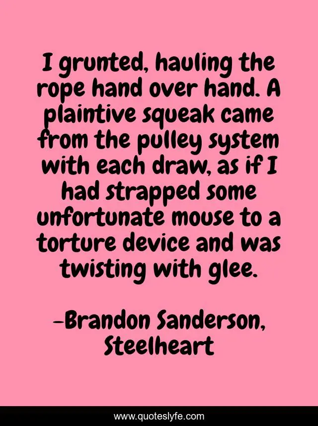 This page presents the quote "I grunted, hauling the rope hand over hand. A plaintive squeak came from the pulley system with each draw, as if I had strapped some unfortunate mouse to a torture device and was twisting with glee.". Author of this quote is Brandon Sanderson, Steelheart. This quote is about make-me-laugh, funny, great, metaphor, awesome, goofy, hilarious, comedy, hysterical,.