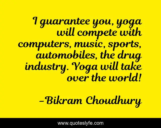 This page presents the quote "I guarantee you, yoga will compete with computers, music, sports, automobiles, the drug industry. Yoga will take over the world!". Author of this quote is Bikram Choudhury. This quote is about world, computers, music,.