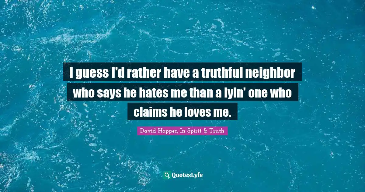 This page presents the quote "I guess I'd rather have a truthful neighbor who says he hates me than a lyin' one who claims he loves me.". Author of this quote is David Hopper, In Spirit & Truth. This quote is about childhood-friends, coming-of-age-novel, historical-fiction, race-in-america,.