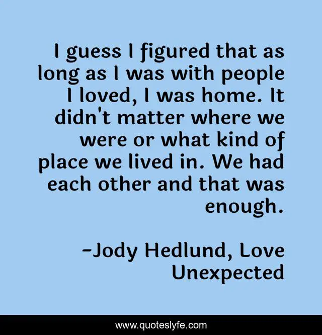 This page presents the quote "I guess I figured that as long as I was with people I loved, I was home. It didn't matter where we were or what kind of place we lived in. We had each other and that was enough.". Author of this quote is Jody Hedlund, Love Unexpected. .