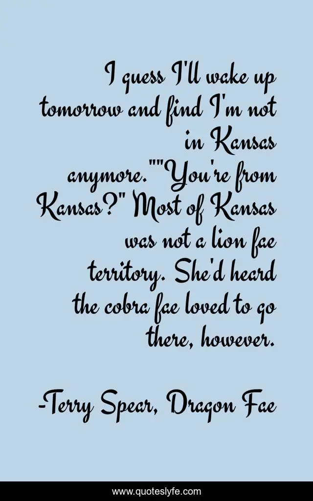 This page presents the quote "I guess I'll wake up tomorrow and find I'm not in Kansas anymore.""You're from Kansas?" Most of Kansas was not a lion fae territory. She'd heard the cobra fae loved to go there, however.". Author of this quote is Terry Spear, Dragon Fae. This quote is about dragon-fae, faeries, ya, dragons,.