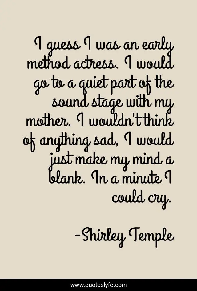 This page presents the quote "I guess I was an early method actress. I would go to a quiet part of the sound stage with my mother. I wouldn't think of anything sad, I would just make my mind a blank. In a minute I could cry.". Author of this quote is Shirley Temple. This quote is about mind, think, mother,.