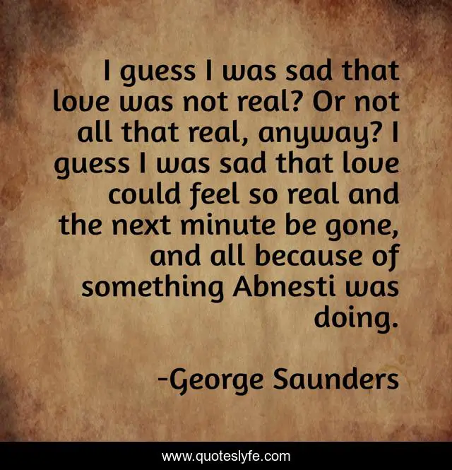 This page presents the quote "I guess I was sad that love was not real? Or not all that real, anyway? I guess I was sad that love could feel so real and the next minute be gone, and all because of something Abnesti was doing.". Author of this quote is George Saunders. This quote is about neurology, love, reality, affection, perception,.