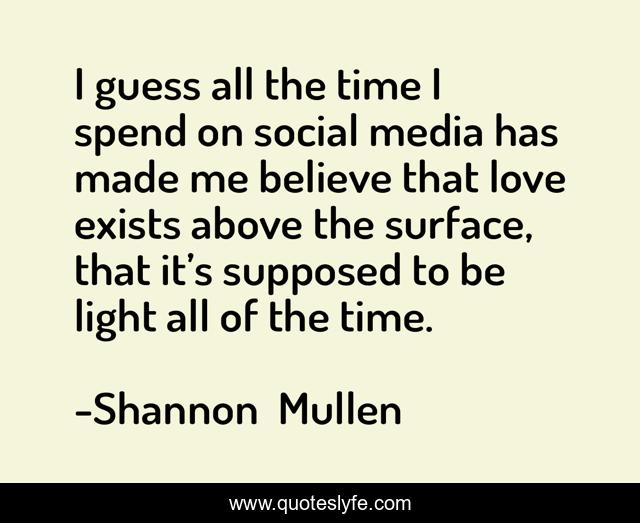 This page presents the quote "I guess all the time I spend on social media has made me believe that love exists above the surface, that it’s supposed to be light all of the time.". Author of this quote is Shannon Mullen. This quote is about relationships, social-media, lightness,.
