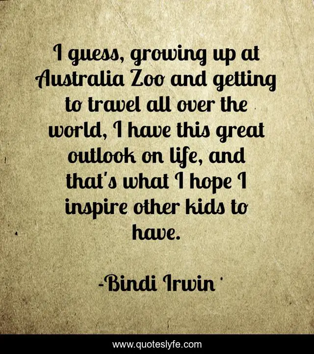 This page presents the quote "I guess, growing up at Australia Zoo and getting to travel all over the world, I have this great outlook on life, and that's what I hope I inspire other kids to have.". Author of this quote is Bindi Irwin. This quote is about life, great, hope,.