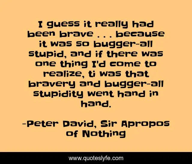 This page presents the quote "I guess it really had been brave . . . because it was so bugger-all stupid, and if there was one thing I'd come to realize, ti was that bravery and bugger-all stupidity went hand in hand.". Author of this quote is Peter David, Sir Apropos of Nothing. This quote is about entipy, peter-david, medieval, pessimism, romance, fantasy, stupidity, apropos, sir-apropos-of-nothing,.