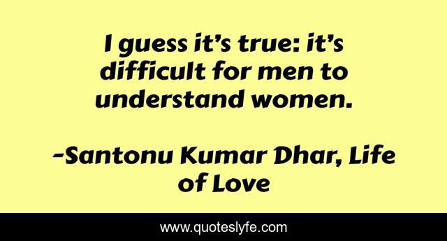 This page presents the quote "I guess it’s true: it’s difficult for men to understand women.". Author of this quote is Santonu Kumar Dhar, Life of Love. This quote is about life, novel, love, men, novelist, affection, women,.
