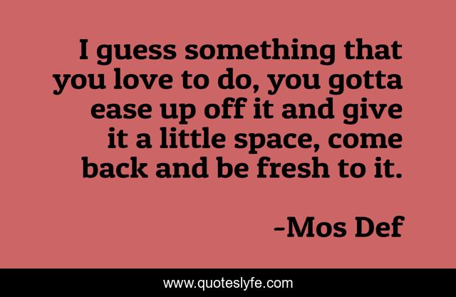 This page presents the quote "I guess something that you love to do, you gotta ease up off it and give it a little space, come back and be fresh to it.". Author of this quote is Mos Def. This quote is about little, love, affection,.