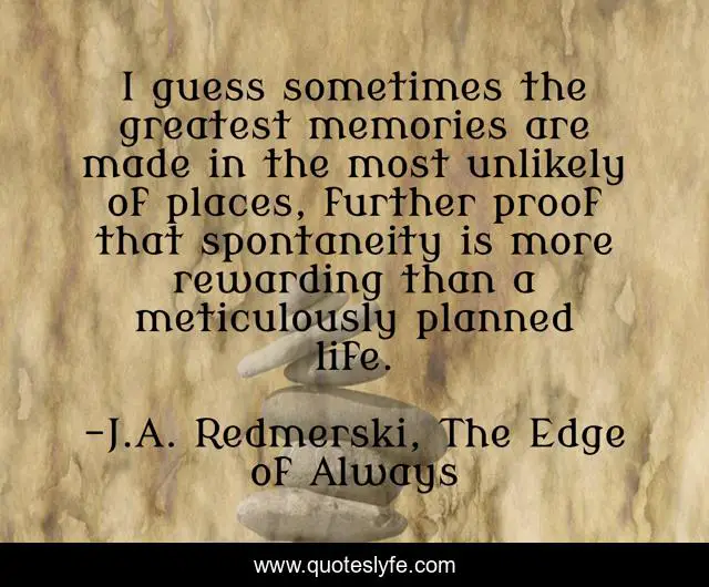 This page presents the quote "I guess sometimes the greatest memories are made in the most unlikely of places, further proof that spontaneity is more rewarding than a meticulously planned life.". Author of this quote is J.A. Redmerski, The Edge of Always. This quote is about memories, life, spontaneity, camryn-bennett,.