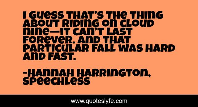 This page presents the quote "I guess that’s the thing about riding on cloud nine—it can’t last forever. And that particular fall was hard and fast.". Author of this quote is Hannah Harrington, Speechless. This quote is about life, cloud-nine, happiness, fall,.