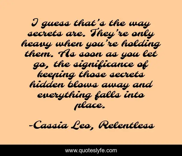 This page presents the quote "I guess that’s the way secrets are. They’re only heavy when you’re holding them. As soon as you let go, the significance of keeping those secrets hidden blows away and everything falls into place.". Author of this quote is Cassia Leo, Relentless. .