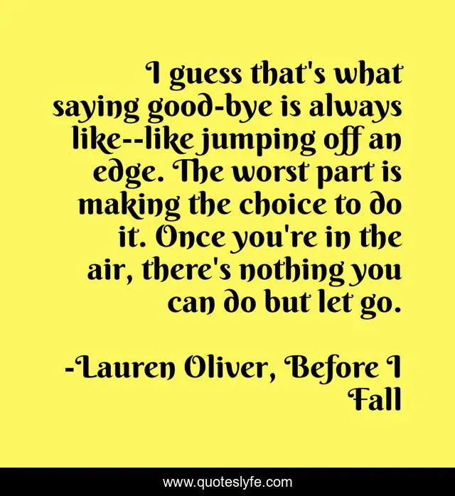 This page presents the quote "I guess that's what saying good-bye is always like--like jumping off an edge. The worst part is making the choice to do it. Once you're in the air, there's nothing you can do but let go.". Author of this quote is Lauren Oliver, Before I Fall. This quote is about before-i-fall, young-adult-fiction,.