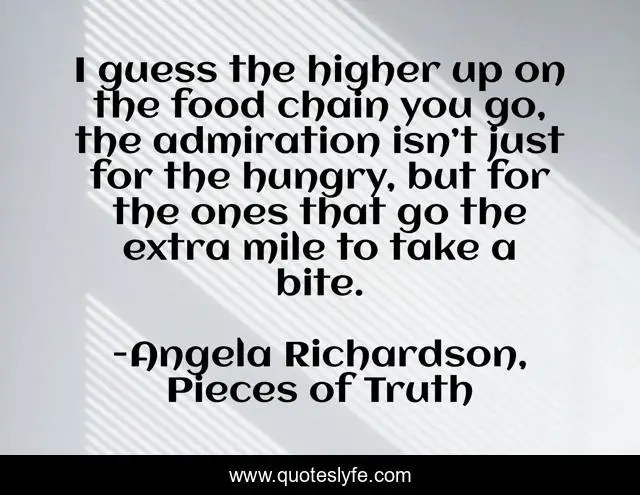 This page presents the quote "I guess the higher up on the food chain you go, the admiration isn’t just for the hungry, but for the ones that go the extra mile to take a bite.". Author of this quote is Angela Richardson, Pieces of Truth. This quote is about chasing-love, manipulation, war, mission,.