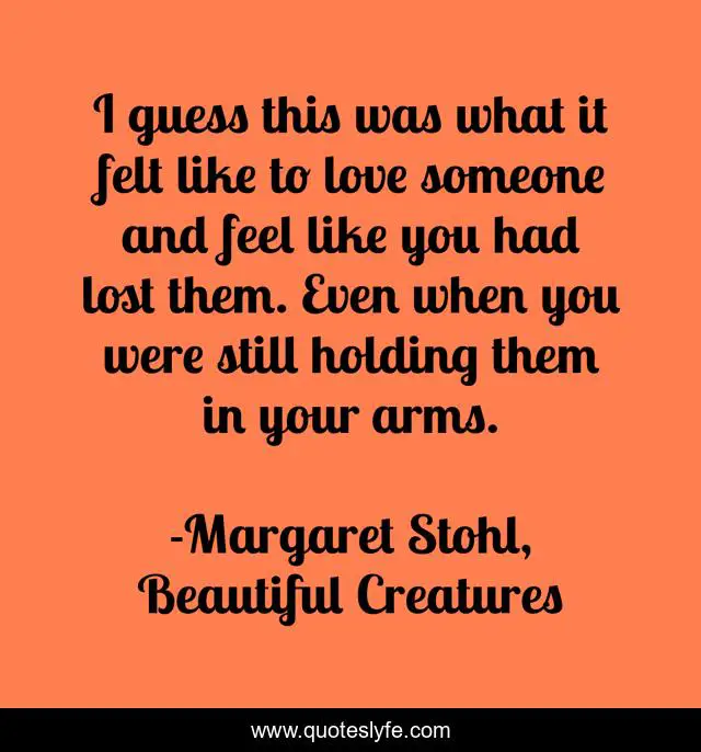 This page presents the quote "I guess this was what it felt like to love someone and feel like you had lost them. Even when you were still holding them in your arms.". Author of this quote is Margaret Stohl, Beautiful Creatures. This quote is about feel, loss, love, affection, pain,.