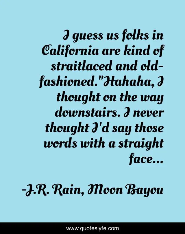 This page presents the quote "I guess us folks in California are kind of straitlaced and old-fashioned."Hahaha, I thought on the way downstairs. I never thought I'd say those words with a straight face...". Author of this quote is J.R. Rain, Moon Bayou. This quote is about detective, new-orleans, vampires, loup-garou, shifters, time-travel, witches, voodoo,.