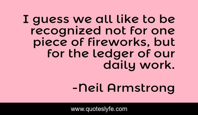 This page presents the quote "I guess we all like to be recognized not for one piece of fireworks, but for the ledger of our daily work.". Author of this quote is Neil Armstrong. This quote is about fireworks, like, daily,.