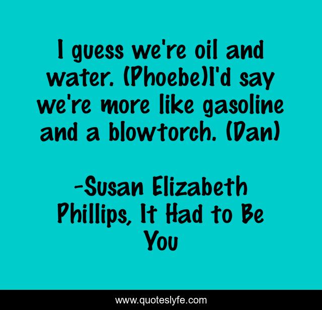This page presents the quote "I guess we're oil and water. (Phoebe)I'd say we're more like gasoline and a blowtorch. (Dan)". Author of this quote is Susan Elizabeth Phillips, It Had to Be You. This quote is about cute, comedy, funny,.