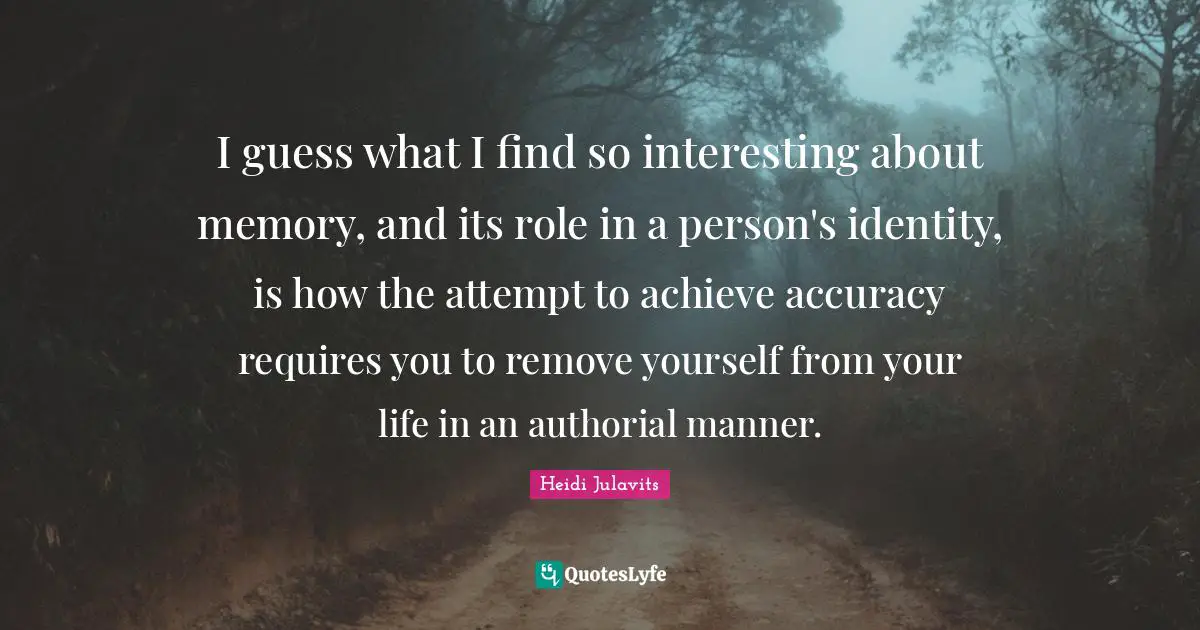 This page presents the quote "I guess what I find so interesting about memory, and its role in a person's identity, is how the attempt to achieve accuracy requires you to remove yourself from your life in an authorial manner.". Author of this quote is Heidi Julavits. This quote is about achieve, memories, life, remove, identity, interesting, accuracy,.
