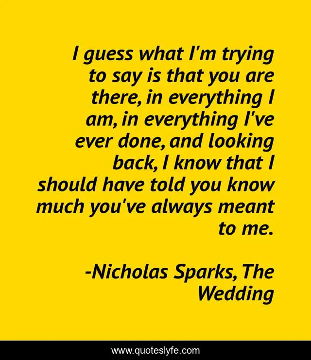 This page presents the quote "I guess what I'm trying to say is that you are there, in everything I am, in everything I've ever done, and looking back, I know that I should have told you know much you've always meant to me.". Author of this quote is Nicholas Sparks, The Wedding. This quote is about sharing-love, telling-love, affection, love,.
