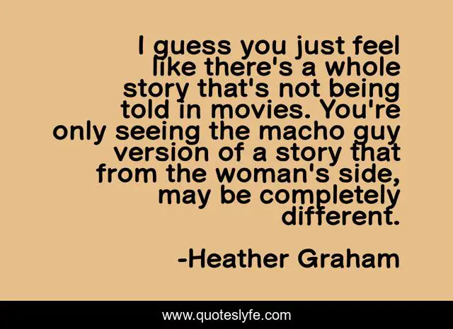 This page presents the quote "I guess you just feel like there's a whole story that's not being told in movies. You're only seeing the macho guy version of a story that from the woman's side, may be completely different.". Author of this quote is Heather Graham. This quote is about story, woman,.