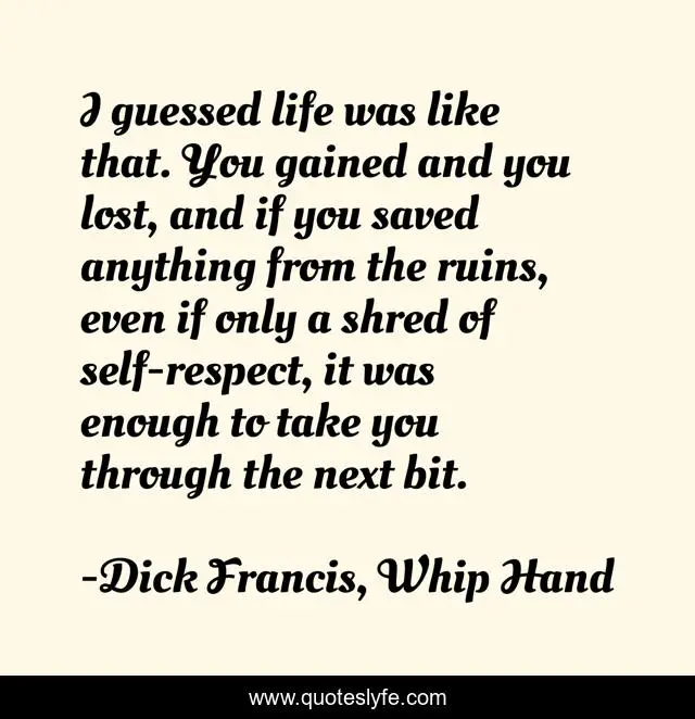 This page presents the quote "I guessed life was like that. You gained and you lost, and if you saved anything from the ruins, even if only a shred of self-respect, it was enough to take you through the next bit.". Author of this quote is Dick Francis, Whip Hand. This quote is about endurance, self-respect, life,.