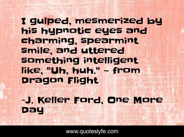 This page presents the quote "I gulped, mesmerized by his hypnotic eyes and charming, spearmint smile, and uttered something intelligent like, "Uh, huh." ~ from Dragon Flight". Author of this quote is J. Keller Ford, One More Day. This quote is about romance, urban-fantasy, roller-coaster, young-adult, short-story,.