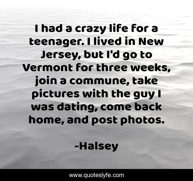 This page presents the quote "I had a crazy life for a teenager. I lived in New Jersey, but I'd go to Vermont for three weeks, join a commune, take pictures with the guy I was dating, come back home, and post photos.". Author of this quote is Halsey. This quote is about home, life, crazy,.
