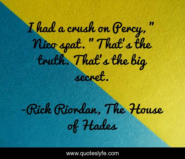 This page presents the quote "I had a crush on Percy, " Nico spat. "That's the truth. That's the big secret.". Author of this quote is Rick Riordan, The House of Hades. This quote is about nico-di-angelo, percy-jackson,.