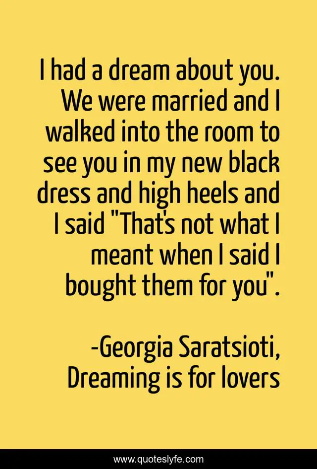 This page presents the quote "I had a dream about you. We were married and I walked into the room to see you in my new black dress and high heels and I said "That's not what I meant when I said I bought them for you".". Author of this quote is Georgia Saratsioti, Dreaming is for lovers. This quote is about funny, humor, shoes, high-heels, marriage, dreaming, comedy, dress, dreams,.