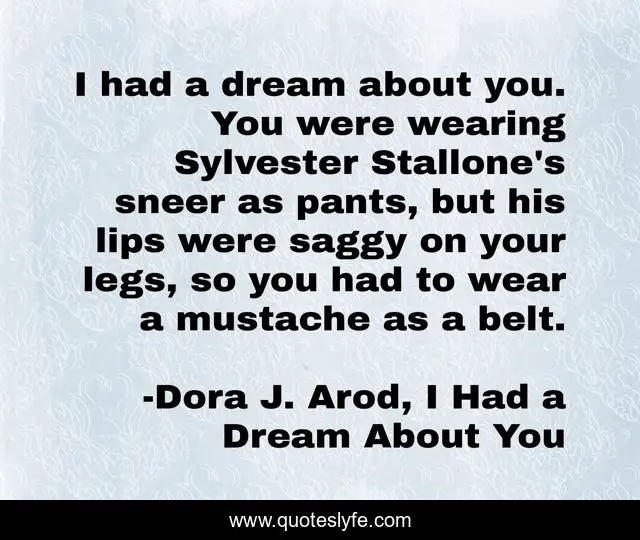 This page presents the quote "I had a dream about you. You were wearing Sylvester Stallone's sneer as pants, but his lips were saggy on your legs, so you had to wear a mustache as a belt.". Author of this quote is Dora J. Arod, I Had a Dream About You. This quote is about relationships, funny, life, humor, sleeping, sleep, dreaming, comedy, dreams,.