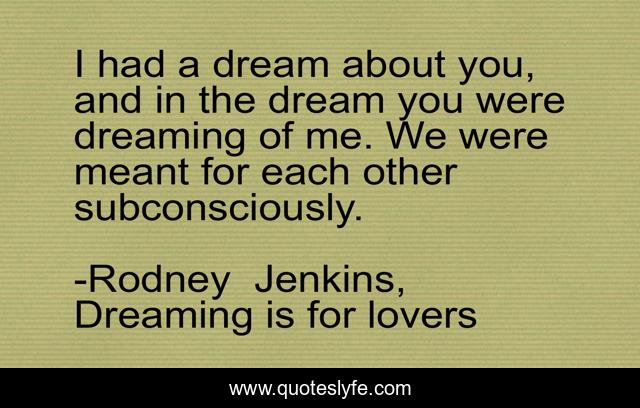 This page presents the quote "I had a dream about you, and in the dream you were dreaming of me. We were meant for each other subconsciously.". Author of this quote is Rodney Jenkins, Dreaming is for lovers. This quote is about subconscious, humor, destiny, dreams, dreaming,.