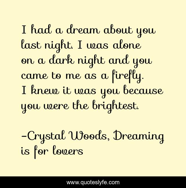 This page presents the quote "I had a dream about you last night. I was alone on a dark night and you came to me as a firefly. I knew it was you because you were the brightest.". Author of this quote is Crystal Woods, Dreaming is for lovers. This quote is about firefly, relationships, love, light, dreaming, word-junkies, romance, brightest, night,.