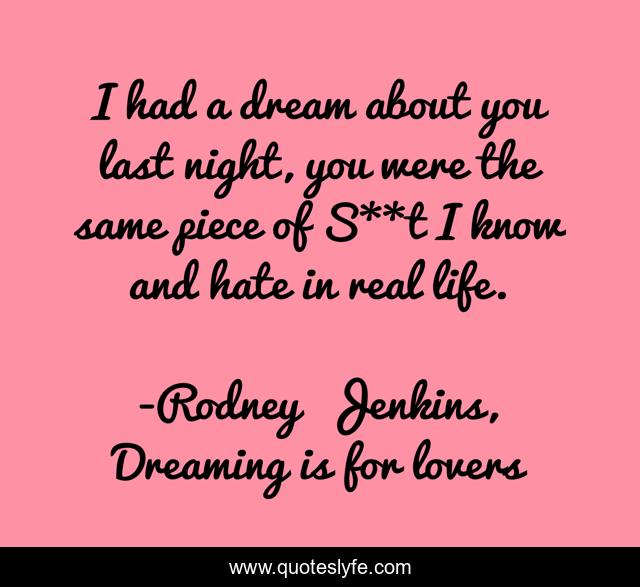 This page presents the quote "I had a dream about you last night, you were the same piece of S**t I know and hate in real life.". Author of this quote is Rodney Jenkins, Dreaming is for lovers. This quote is about relationships, humor, dreams, dreaming,.