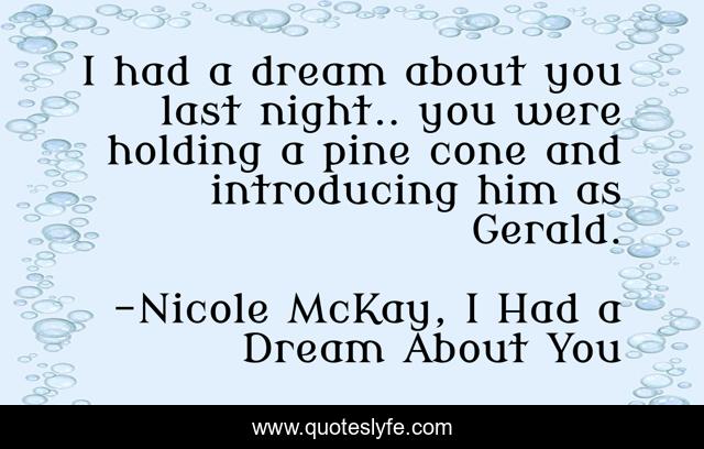 This page presents the quote "I had a dream about you last night.. you were holding a pine cone and introducing him as Gerald.". Author of this quote is Nicole McKay, I Had a Dream About You. This quote is about relationships, funny, life, humor, sleeping, sleep, dreaming, comedy, dreams,.