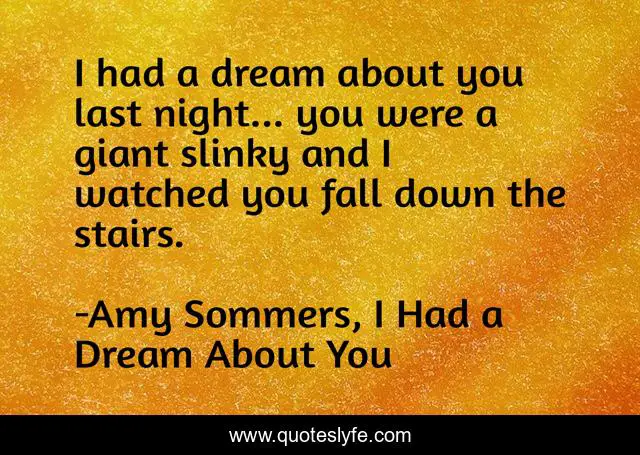 This page presents the quote "I had a dream about you last night... you were a giant slinky and I watched you fall down the stairs.". Author of this quote is Amy Sommers, I Had a Dream About You. This quote is about relationships, funny, life, humor, sleeping, sleep, dreaming, comedy, dreams,.