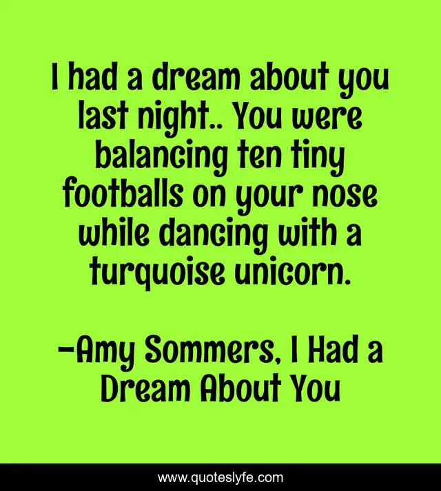 This page presents the quote "I had a dream about you last night.. You were balancing ten tiny footballs on your nose while dancing with a turquoise unicorn.". Author of this quote is Amy Sommers, I Had a Dream About You. This quote is about relationships, funny, life, humor, sleeping, sleep, dreaming, comedy, dreams,.