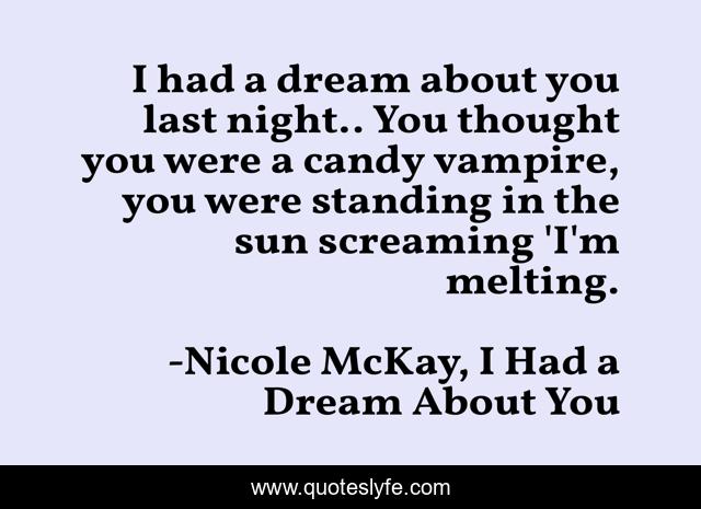 This page presents the quote "I had a dream about you last night.. You thought you were a candy vampire, you were standing in the sun screaming 'I'm melting.". Author of this quote is Nicole McKay, I Had a Dream About You. This quote is about relationships, funny, life, humor, sleeping, sleep, dreaming, comedy, dreams,.