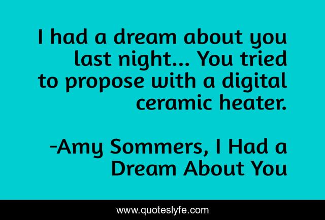This page presents the quote "I had a dream about you last night... You tried to propose with a digital ceramic heater.". Author of this quote is Amy Sommers, I Had a Dream About You. This quote is about relationships, funny, life, humor, sleeping, sleep, dreaming, comedy, dreams,.