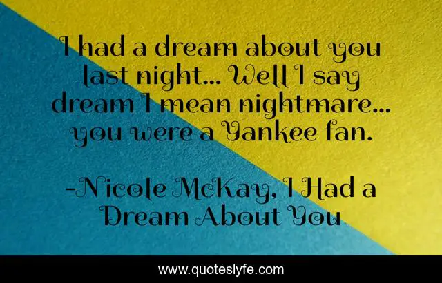 This page presents the quote "I had a dream about you last night... Well I say dream I mean nightmare... you were a Yankee fan.". Author of this quote is Nicole McKay, I Had a Dream About You. This quote is about relationships, funny, life, humor, sleeping, sleep, dreaming, comedy, dreams,.