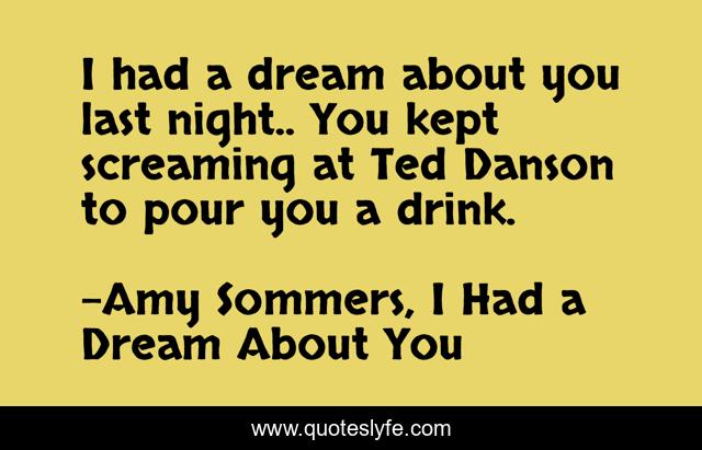 This page presents the quote "I had a dream about you last night.. You kept screaming at Ted Danson to pour you a drink.". Author of this quote is Amy Sommers, I Had a Dream About You. This quote is about relationships, funny, life, humor, sleeping, sleep, dreaming, comedy, dreams,.