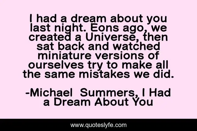 This page presents the quote "I had a dream about you last night. Eons ago, we created a Universe, then sat back and watched miniature versions of ourselves try to make all the same mistakes we did.". Author of this quote is Michael Summers, I Had a Dream About You. This quote is about relationships, funny, life, humor, sleeping, sleep, dreaming, comedy, dreams,.