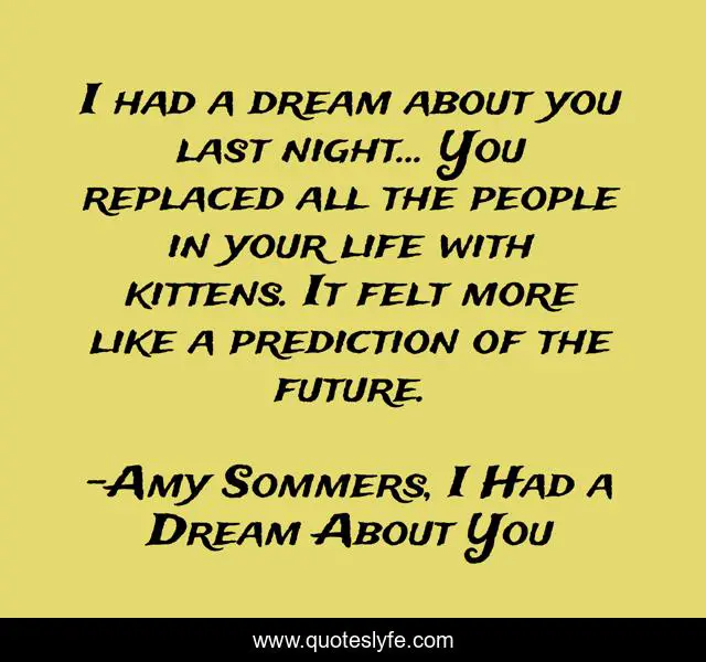 This page presents the quote "I had a dream about you last night... You replaced all the people in your life with kittens. It felt more like a prediction of the future.". Author of this quote is Amy Sommers, I Had a Dream About You. This quote is about relationships, funny, life, humor, sleeping, sleep, dreaming, comedy, dreams,.