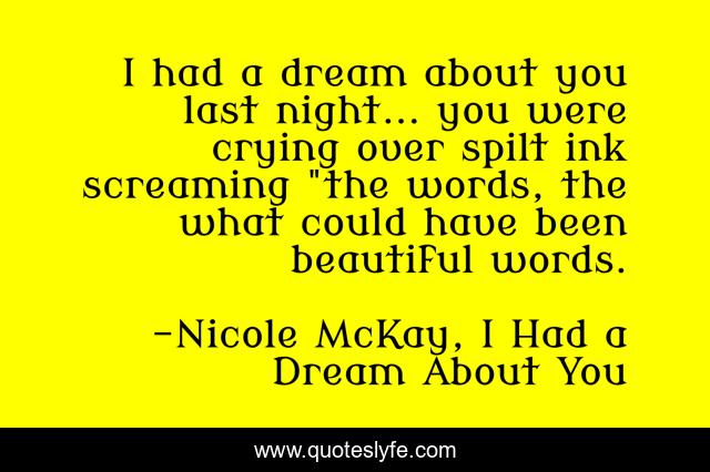 This page presents the quote "I had a dream about you last night... you were crying over spilt ink screaming "the words, the what could have been beautiful words.". Author of this quote is Nicole McKay, I Had a Dream About You. This quote is about relationships, funny, life, humor, sleeping, sleep, dreaming, comedy, dreams,.
