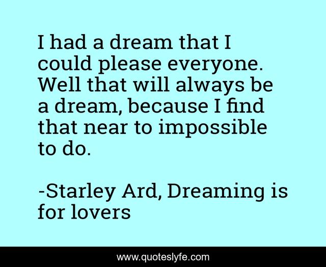 This page presents the quote "I had a dream that I could please everyone. Well that will always be a dream, because I find that near to impossible to do.". Author of this quote is Starley Ard, Dreaming is for lovers. This quote is about dreaming, wisdom, impossible, pleasure, dream, dreams,.
